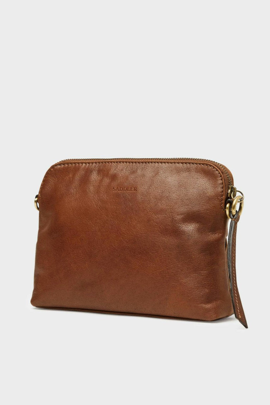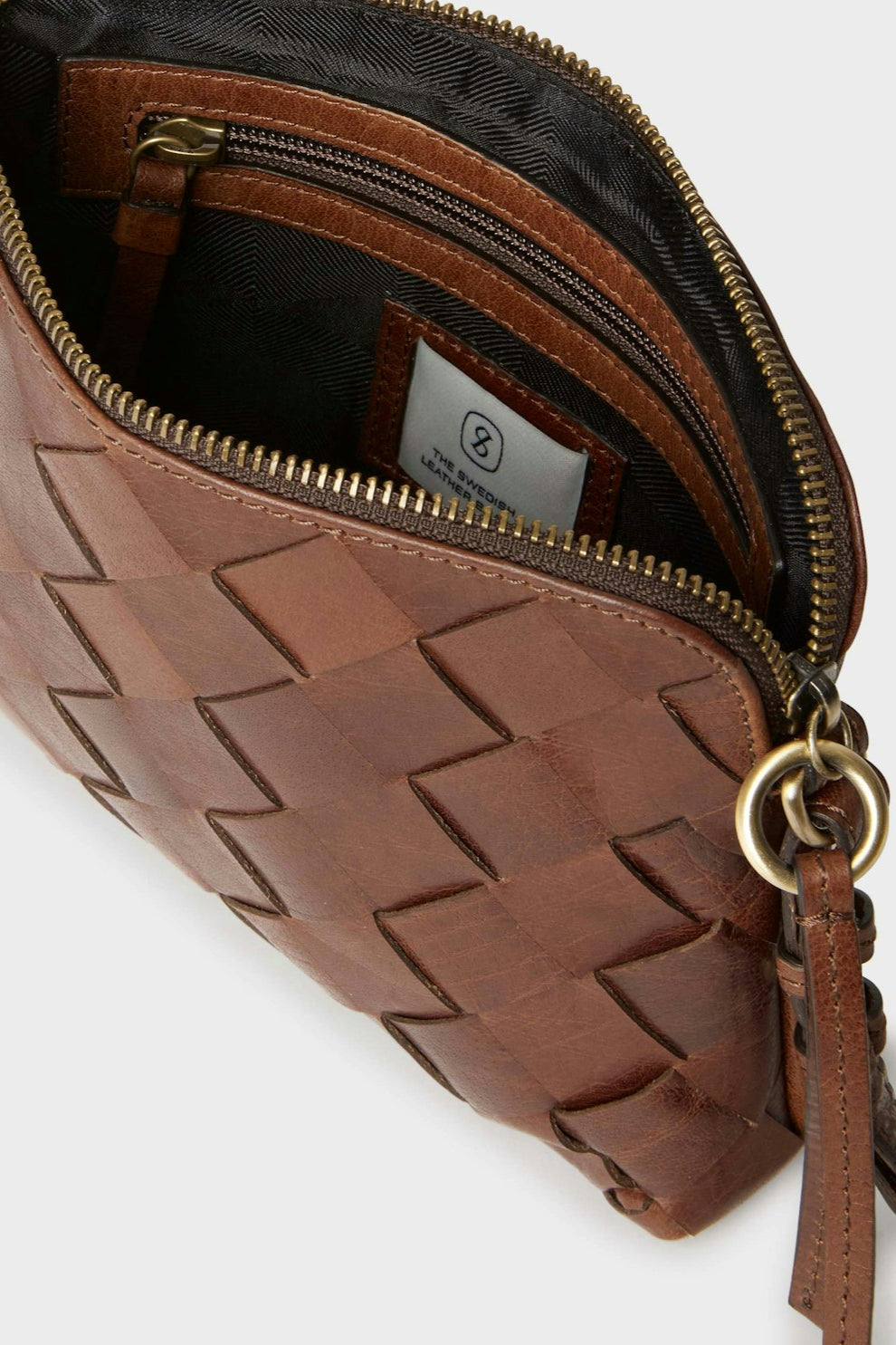 Detaljer i matt mässingfärgad metall. Lädret i den här produkten är av högsta kvalitet och har behandlats i garveri certifierat av Leather Working Group
